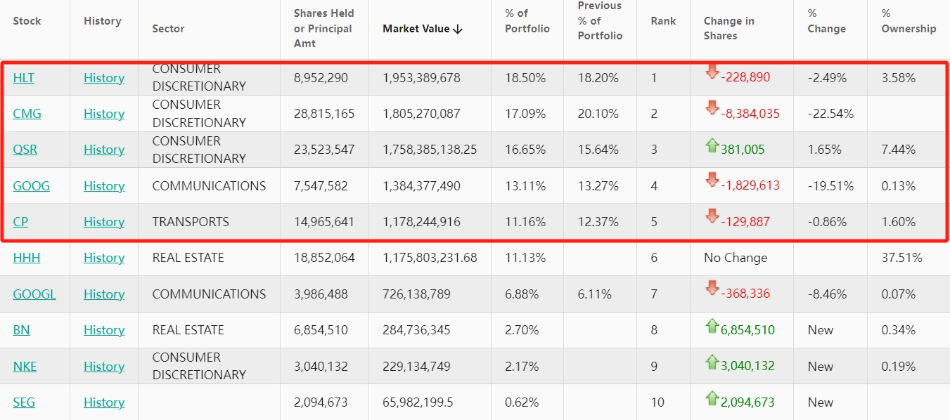 在前五大重仓股中,希尔顿酒店(HLT.US)位列第一,持仓约895.2万股,持仓市值约19.53亿美元,占投资组合比例为18.5%,较上季度持仓数量下降2.49%;