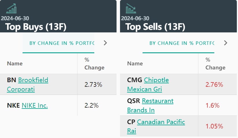 前三大卖出标的分别是:墨式烧烤、餐饮品牌国际、加拿大太平洋铁路。值得注意的是,该基金针对谷歌两只股票谷歌-A、谷歌-C都进行了明显数量的减持。