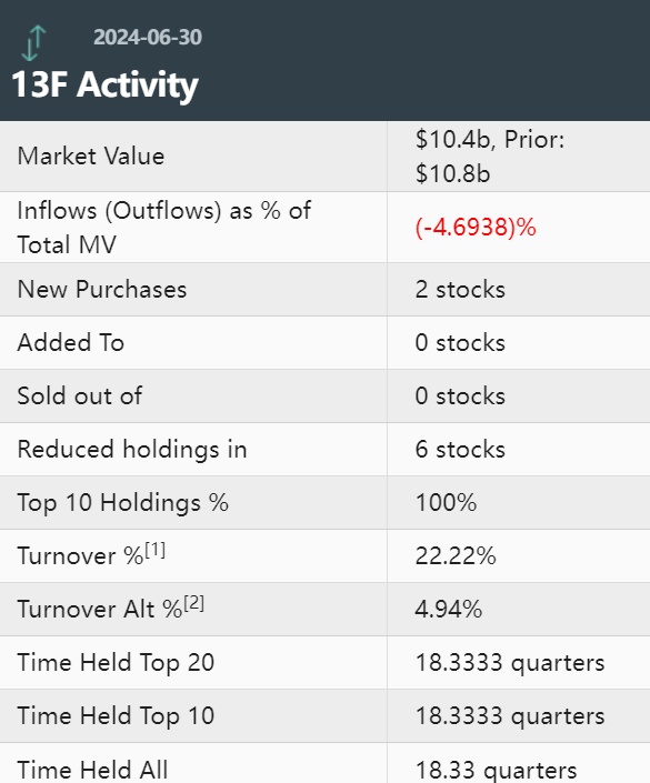 智通财经获悉,对冲基金大佬比尔·阿克曼旗下的潘兴广场资本管理公司公布第二季度持仓报告(13F)。据统计,潘兴广场第二季度持仓总市值为104亿美元,上一季度总市值为108亿美元,环比下降4.7%。潘兴广场在第二季度的持仓组合中,新增2只个股,增持3只个股,清仓0只个股,减持了6只个股。其中,前十大持仓标的占总市值的100%。