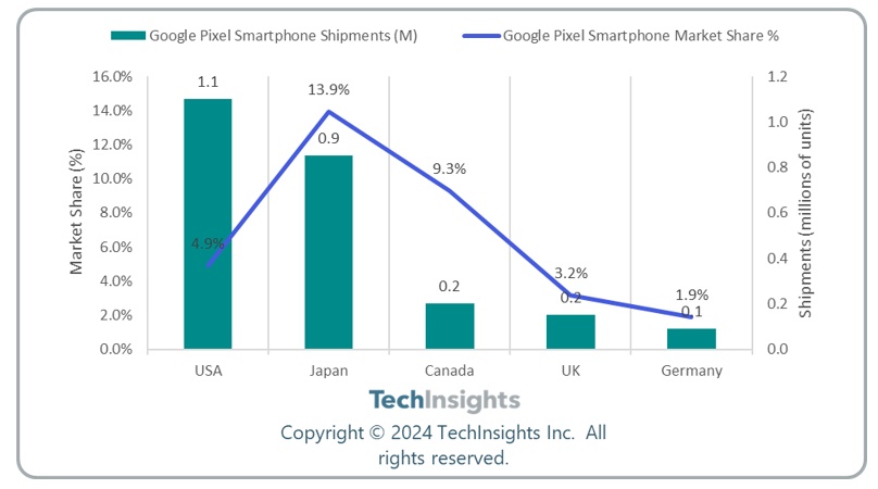 智通财经APP获悉,TechInsights发文称,谷歌(GOOGL.US)于2024年8月13日发布了其最新的Pixel 9系列智能手机。该系列包括Pixel 9、Pixel 9 Pro、Pixel 9 Pro XL和Pixel 9 Pro Fold等型号。随着Pixel 9系列设备市场的扩张(将在32个市场推出),谷歌正朝着Techinsights预测的2024年和2025年两位数增长目标稳步前进。