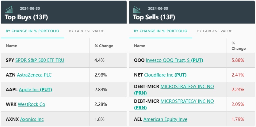 前五大卖出标的分别是:Invesco纳斯达克100指数ETF看跌期权(QQQ.US,PUT)、Cloudflare看跌期权(NET.US,PUT)、MicroStrategy(MSTR.US)票据(12月1日到期)、MicroStrategy(MSTR.US)票据(2月1日到期)、American Equity Investment Life Holding, Co. (AEL.US)。