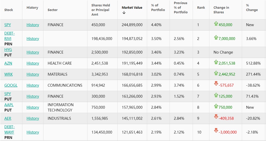 iShares iBoxx高收益公司债指数ETF看跌期权(HYG.US,PUT)位列第三,持仓250万股,持仓市值约1.93亿美元,占投资组合比例为3.46%,与上一季度持仓数量相同。