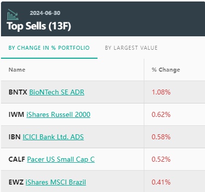 前五大卖出标的分别是:BioNTech(BNTX.US)、iShares罗素2000指数ETF(IWM.US)、印度工业信贷投资银行(IBN.US)、Pacer US Small Cap Cash Cows 100 ETF(CALF.US)和巴西ETF-iShares(EWZ.US)。