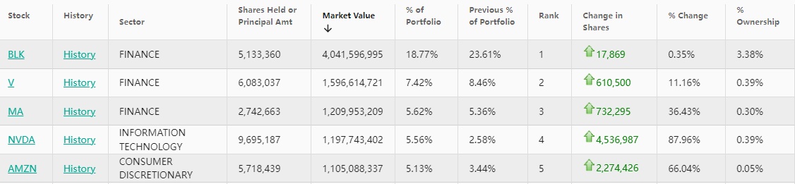 其余数据方面,截至第二季度,淡马锡前五大重仓股分别为:贝莱德(BLK.US)位列第一,持仓约513万股,持仓市值约40.4亿美元,占投资组合比例为18.77%,较上季度持仓数量增加0.35%。