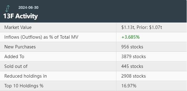 据统计,美银第二季度持仓总市值约1.13万亿美元,上一季度总市值为1.07万亿美元,环比增加约3.69%。美银在二季度的投资组合中新增了956只个股,增持了3879只个股,减持了2908只个股,清仓了445只个股。其中前十大持仓标的占总市值的16.97%。
