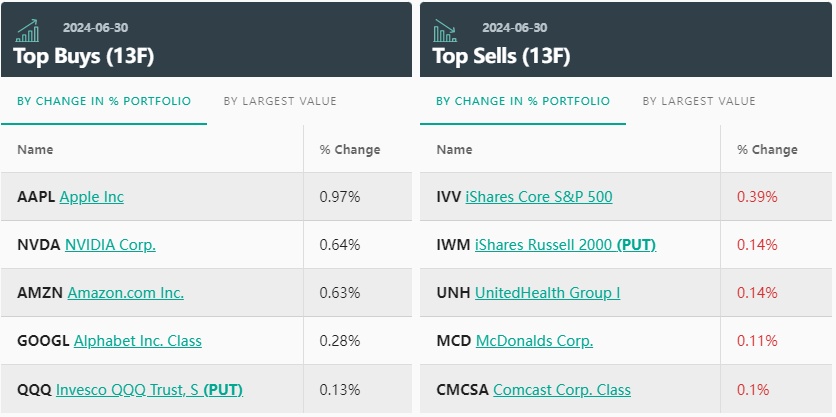 前五大卖出标的分别是:标普500ETF(IVV.US)、罗素2000ETF(IWM.US)、联合健康(UNH.US)、麦当劳(MCD.US)、康卡斯特(CMCSA.US)。
