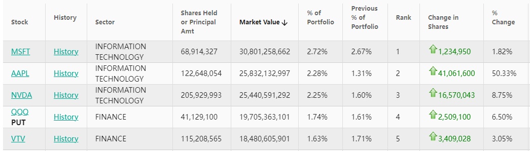 在前五大重仓股中,微软(MSFT.US)位列第一,持仓约6891.43亿股,持仓市值约308.13亿美元,占投资组合比例为2.72%,较上季度持仓数量增加1.82%。