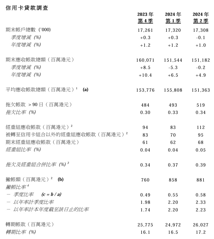 智通财经APP获悉,8月15日,香港金融管理局公布2024年第2季的信用卡贷款调查结果。信用卡应收帐款总额在上季减少5.3%后,于2024年第2季微跌0.2%至6月底的1512亿港元。拖欠及经重组合并比率由上季末的0.37%微升至2024年6月底的0.39%。信用卡季度撇帐率亦由上季的0.55%微升至0.58%。