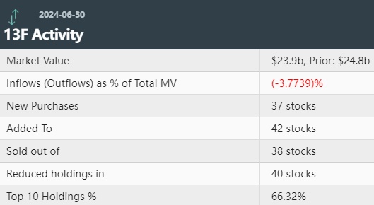 据统计,黑石第二季度持仓总市值为239亿美元,上一季度总市值为248亿美元,环比下降3.6%。黑石在第二季度的美股投资组合中新增37只个股,增持了42只个股,减持了40只个股,清仓38只个股。其中前十大持仓标的占总市值的66.32%。