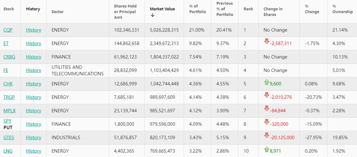 切萨皮克能源(CHK.US)位列第五,持仓约1269万股,持仓市值约10.4亿美元,占投资组合比例为4.36%,较上季度持仓数量增加0.08%。