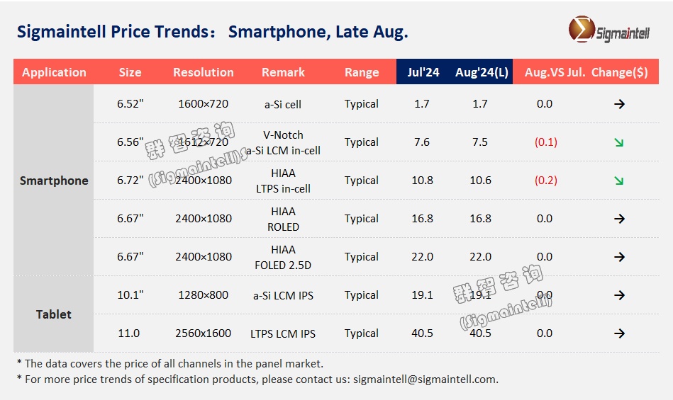 智通财经APP获悉,8月份,低端市场及高端旗舰机型积极的备货节奏延续,中端机型在终端品牌选型策略的调整下,市场备货需求仍然较弱。根据群智咨询(Sigmaintell)预测,智能手机面板整体价格方面仍将呈现稳中有降的趋势。