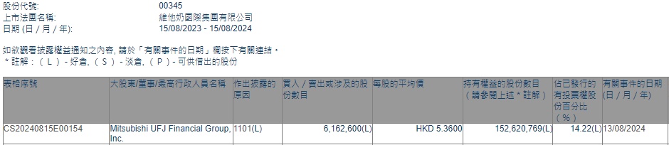 智通财经APP获悉,香港联交所最新资料显示,8月13日,三菱日联金融增持维他奶国际(00345)616.26万股,每股作价5.36港元,总金额约为3303.15万港元。增持后最新持股数目约为1.53亿股,持股比例为14.22%。