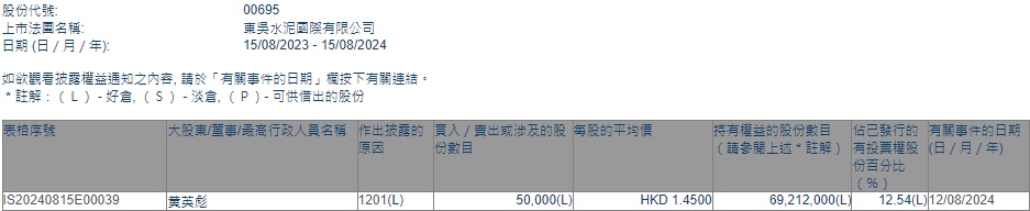 智通财经APP获悉,香港联交所最新资料显示,8月12日,黄英彪减持东吴水泥(00695)5万股,每股作价1.45港元,总金额为7.25万港元。减持后最新持股数目为6921.2万股,持股比例为12.54%。
