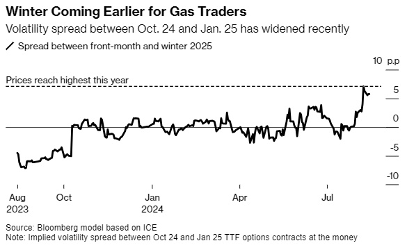 在8月,与荷兰TTF天然气期权交易相关的隐含波动率(衡量基础衍生品合约价格昂贵与否的重要指标)大幅上升,10月和明年1月荷兰天然气期权之间的的隐含波动率之差目前接近合约开始交易以来的最高水平。