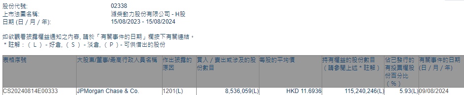 智通财经APP获悉,香港联交所最新资料显示,8月9日,摩根大通减持潍柴动力(02338)853.6059万股,每股作价11.6936港元,总金额约为9981.73万港元。减持后最新持股数目约为1.15亿股,持股比例为5.93%。