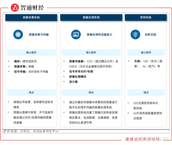 作为提供人体内部解剖结构图像的医用设备,医用内窥镜集合光学、人体工程学、精密机械、现代电子、计算机软件等为一体,主要由图像采集系统、图像处理系统和照明系统三个部分组成,且每一个环节都具有较高的技术壁垒