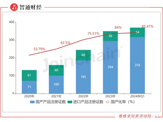 注册端方面,普通电子内镜从Ⅲ类降为Ⅱ类,原先3年左右的注册周期有望缩减至1-2年。通过创口进入人体内的光学内窥镜由Ⅲ类降为Ⅱ类,厂商申报常规内窥镜注册证时不再需要进行临床试验,全面缩短国产内镜的注册流程。2024年一季度,内窥镜产品注册数和国产化比例再创新高。据MDCLOUD(医械数据云)统计,截至2024年3月31日,内窥镜摄像系统有效产品注册总数为370件,其中国产产品有316件,国产化率为85.41%;一季度内窥镜摄像系统新增产品注册共27件,国产注册证有27件,首次注册(或首次备案)的产品有27件,同比增长22.73%。