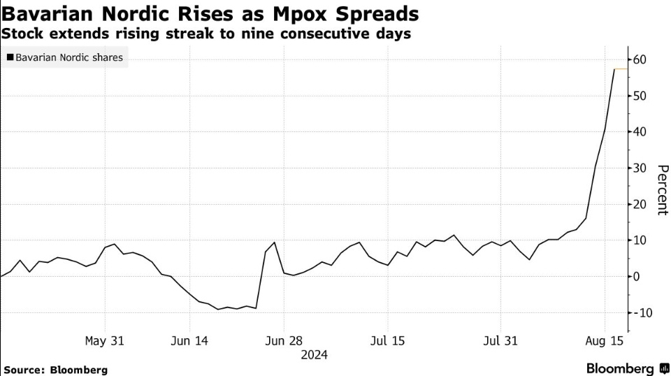 智通财经APP获悉,作为唯一一家在美国和欧洲获准生产猴痘(Mpox)疫苗的公司,巴伐利亚北欧公司(Bavarian Nordic A/S)现正寻求将疫苗适用范围扩展至青少年。这家位于哥本哈根北部的企业于周五宣布,计划向欧洲药品管理局提交临床数据,以期将疫苗使用范围扩大至欧洲 12 至 17 岁的年轻群体。此前瑞典、巴基斯坦等地报告新增猴痘病例。美股猴痘概念股盘前上涨,SIGA Technologies(SIGA.US)涨近1%,Emergent Biosolutions(EBS.US)涨超8%,GeoVax Labs(GOVX.US)涨超10%。