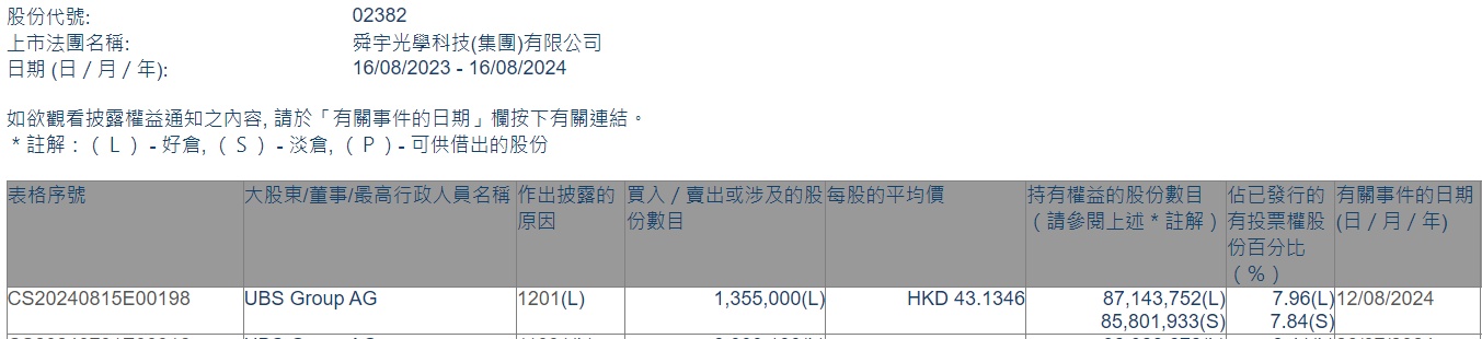 智通财经APP获悉,香港联交所最新资料显示,8月12日,UBS Group AG减持舜宇光学科技(02382)135.5万股,每股作价43.1346港元,总金额约为5844.74万港元。减持后最新持股数目约为8714.38万股,最新持股比例为7.96%。