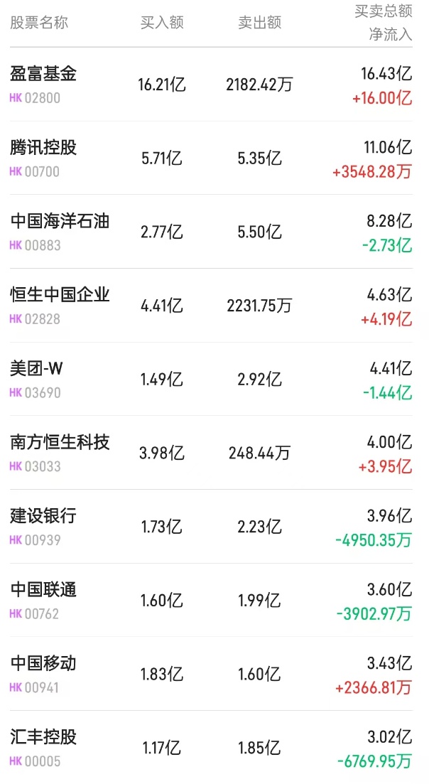 北水净买入最多的个股是盈富基金(02800)、南方恒生科技(03033)、恒生中国企业(02828)。北水净卖出最多的个股是建设银行(00939)、汇丰控股(00005)、中国移动(00941)。