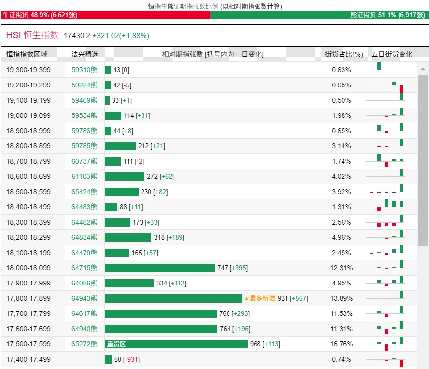 法兴恒指牛熊证街货分布图中的数据显示,熊证街货重货区在17500-17599区间,该区间最新熊证数量为968张,较上一交易增加113张;最多新增在17800-17899区间,该区间最新熊证数量为931张,较上一交易日增加557张。