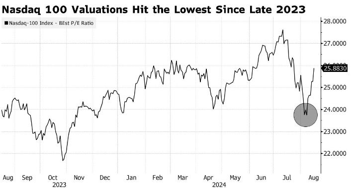 智通财经获悉,8月5日,当纳斯达克100指数在开盘后几秒钟内暴跌超过5%,证实了人们对科技泡沫破裂的担忧时。仅仅两周时间,几轮带来利好的数据出炉后,几乎所有的担忧都被迅速抛到一边。事实证明,这是自2022年以来科技股最严重的盘中抛售,在投资者看来,这是一次重置,消除了估值中的一些泡沫——他们已经重新涌入。