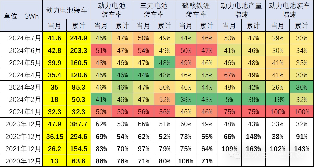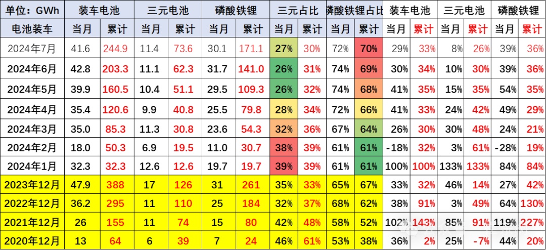 2024年7月的锂电池装车42GWh,同比增29%。三元电池装车11.4GWh,占比27%,低于同期;而磷酸铁锂电池装车量30GWh,占比72%,三元电池增长有所放缓。1-7月锂电池装车245G,同比增长29%。