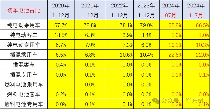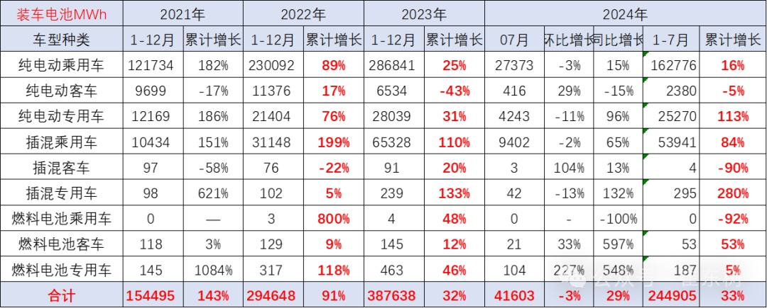 乘用车电池需求增长持续较强,2024年的纯电动乘用车的电池需求增长16%,而插混乘用车的电池需求增长84%,持续较强增长。由于客车新能源需求较弱,7月客车的电池降15%,而纯电动专用车的电池需求是大幅增长96%。
