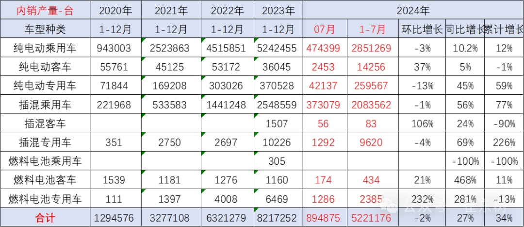 根据合格证电池量测算2024年7月的合格证产品产量是89.5万台。1-7月522万台较强,其中纯电动乘用车285万台,插混乘用车208万台,纯电动专用车26万台,这样的产量数据还是较好的。