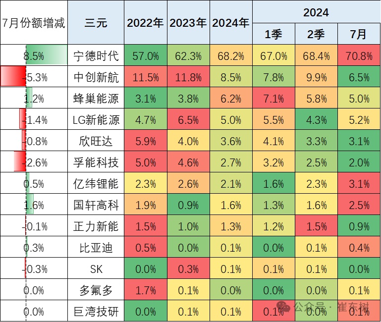 目前动力电池的产量中装车的比例在不断的降低,2021年动力电池装车的生产电池装机率达到70%, 2022年是54%,2023年是50%,2024年1-7月降到47%,其中三元装车率49%,磷酸铁锂46%。