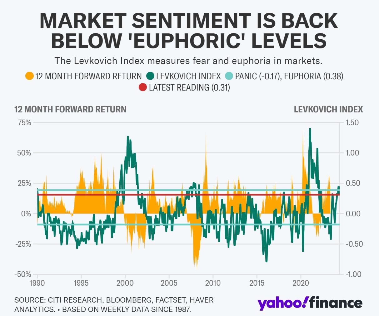 Pettit 的团队使用一项名为列夫科维奇指数的指标来确定市场情绪,该指标考虑了投资者的空头仓位和杠杆率等因素。目前的读数为 0.31,低于 0.38,这表明市场已进入欣快期或过度拉伸的峰值。如下图所示,市场进入欣快期之前的时期通常会出现下跌。