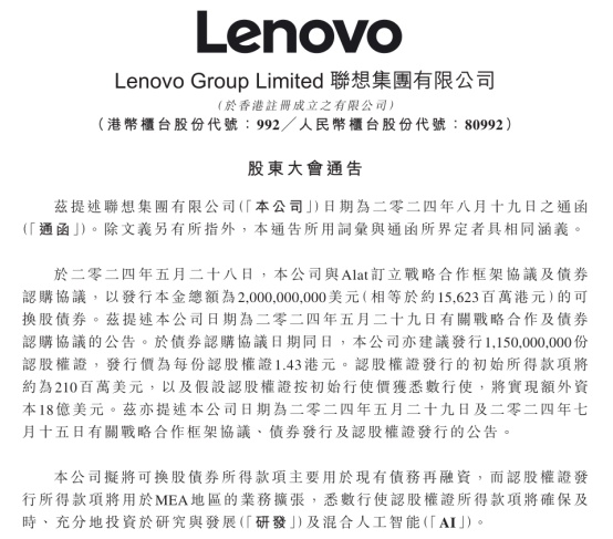 8月19日,联想集团在港交所发布公告,将于9月12日以线上+线下的混合方式举行股东大会,对公司与Alat订立战略合作框架协议及债券认购协议进行表决。Alat是沙特阿拉伯王国PIF的全资附属公司,拥有独立投资授权,是一家拥有1000亿美元资本的长期战略投资者。
