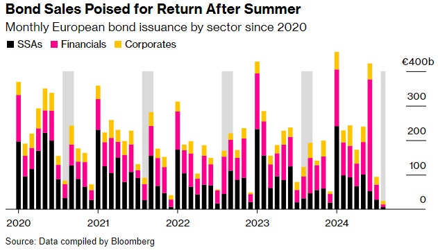 数据显示,债券发行量在 8 月最后一周趋于大幅增加,2022 年和 2023 年的债券销售额均超过 300 亿欧元。