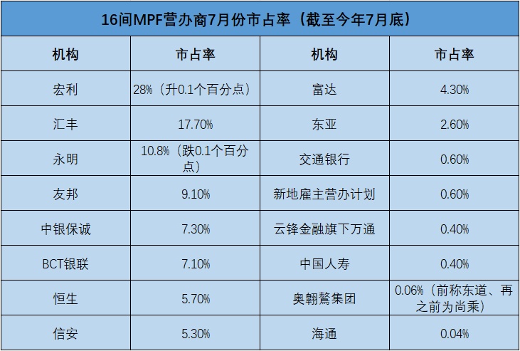 据积金评级的最新统计,截至7月底止,上月只有两间经营者的市场占有率按月有变动,升跌各有1间,其中宏利升0.1个百分点、永明金融跌0.1个百分点。
