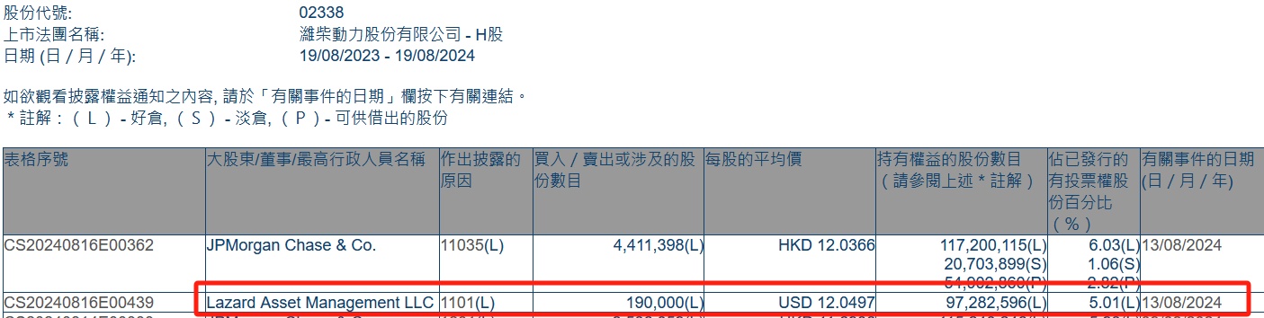 智通财经APP获悉,香港联交所最新资料显示,8月13日,Lazard Asset Management LLC增持潍柴动力(02338)19万股,每股作价12.0497美元,总金额约为228.94万美元。增持后最新持股数目为9728.2596万股,持股比例为5.01%。