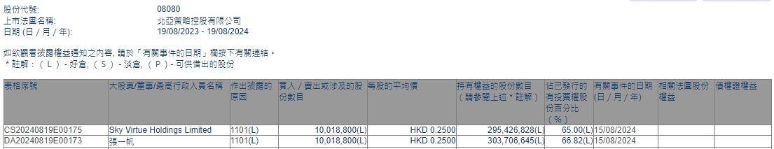 智通财经APP获悉,香港联交所最新资料显示,8月15日,Sky Virtue Holdings Limited增持北亚策略(08080)1001.88万股,每股作价0.25港元,总金额约为250.47万港元。增持后最新持股数目约为2.23亿股,最新持股比例为65.00%。