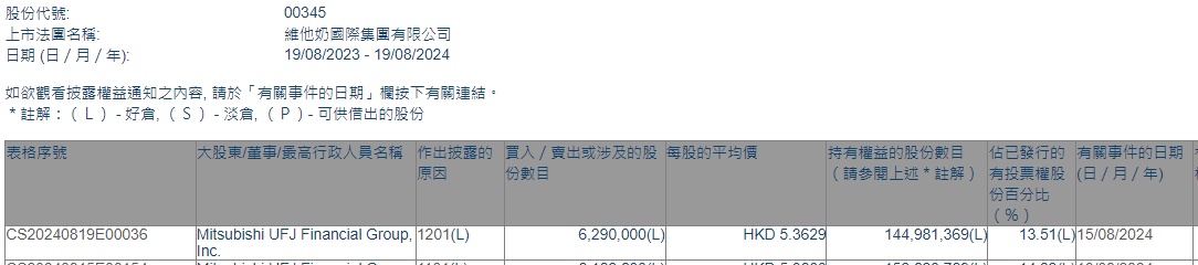 智通财经APP获悉,香港联交所最新资料显示,8月15日,三菱日联金融减持维他奶国际(00345)629万股,每股作价5.3629港元,总金额约为3373.26万港元。减持后最新持股数目约为1.45亿股,持股比例为13.51%。