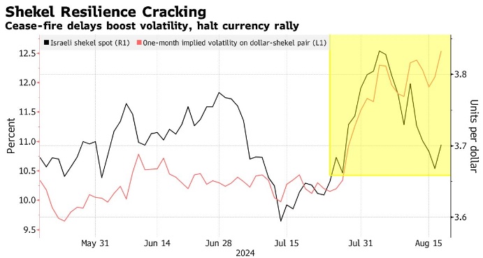 智通财经获悉,周一,以色列货币谢克尔暴跌,该国债券收益率飙升至8月1日以来的最高水平,因为难以实现的停火和再次升级的威胁让投资者紧张不安。谢克尔兑美元汇率下跌1.2%,至1美元兑3.7139谢克尔,在彭博追踪的150多种货币中表现第二差。根据期权价格,谢克尔的一个月隐含波动率升至2023年10月以来的最高水平。10年期以色列国债收益率连续第二天上涨,以色列基准股指创下一周来最大跌幅。
