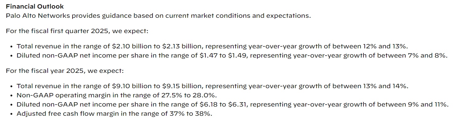 对于整个2025财年的预期,Palo Alto 给出的总营收指引区间为91亿美元至91.5 亿美元,意味着有望同比增长13%至14%,华尔街预期则为91亿美元。2025财年的Non-GAAP每股收益指引区间则为6.18 美元至6.31 美元,意味着有望同比增长9%至11%,高于每股收益6.19美元的华尔街预期。