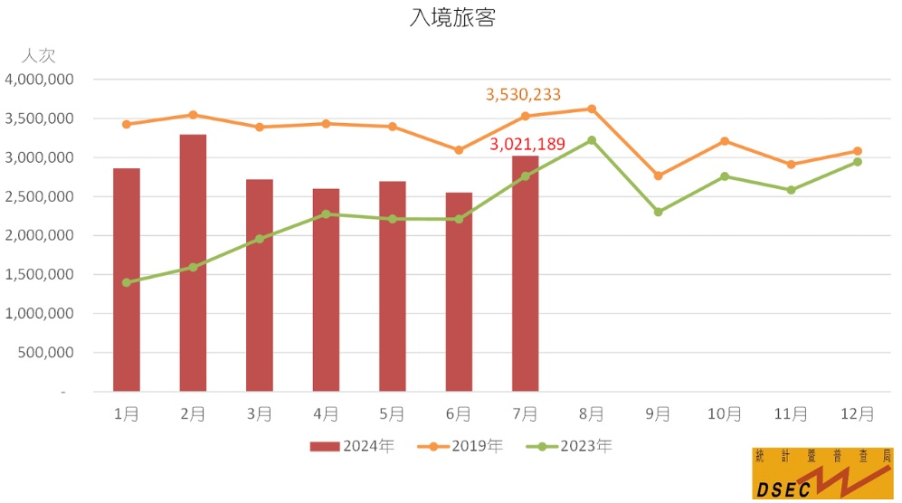 2024年首七个月的入境旅客共19741172人次,同比上升37.0%,恢复至2019年同期的82.9%;国际旅客(1341605人次)恢复至68.1%。不过夜旅客(10485165人次)及留宿旅客(9256007人次)同比分别增加51.8%及23.4%。旅客平均逗留时间(1.2日)同比缩短0.1日;不过夜旅客平均逗留时间(0.2日)减少0.1日,留宿旅客的(2.3日)则维持不变。