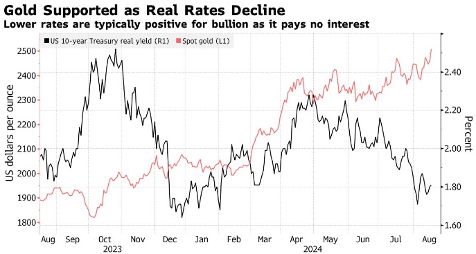 金价最近的飙升,主要是由于市场预期美国政策制定者将很快开始降息,投资者普遍预计美联储将在下月的会议上降息。降息预期的升温拉低了实际利率,为不支付利息的黄金创造了更有利的环境。低利率通常对黄金有利,两者通常呈负相关关系。