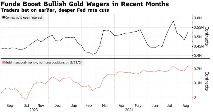随着金价不断走高,对冲基金和投机者的参与度也越来越高。根据美国商品期货交易委员会(CFTC)的数据,Comex黄金期货的净看涨押注接近7月中旬创下的四年高位。上周未平仓合约增加9%意味着投资者对黄金越来越乐观,而不仅仅是平仓。