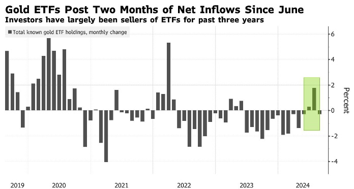 类似的情况也可能出现在黄金支持的交易所交易基金(ETF)中,近几周有迹象显示投资者的兴趣有所增强。虽然黄金价格在3月和4月大幅上涨,但ETF的持有量继续出现净流出,5月中旬全球ETF持有量达到2019年以来的最低水平。然而,从6月份开始,资金流似乎发生了变化,ETF出现了两个月的资金净流入。