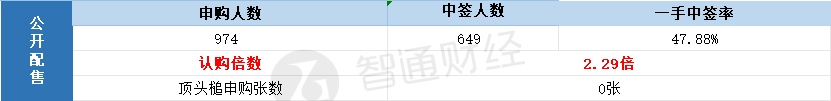 其中,公开配售申购人数974人,一手中签率47.88%,认购倍数约2.29倍。国际配售申购人数未披露,认购倍数约1.01倍。