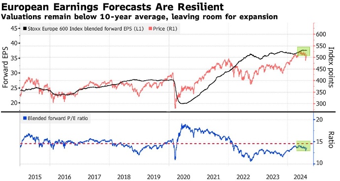 欧洲公司第二季度的收益季好于预期,MSCI欧洲公司的利润增长2.3%。根据数据,这是自2023年初以来的首次同比增长。然而,这种势头并没有传导到股价上,由于对经济的担忧挥之不去,自今年7月中旬以来,该指数仍下跌了约2%。分析师们一直不愿下调业绩预期,这让估值受到了抑制。即使在最近的反弹之后,欧洲斯托克600指数的远期市盈率仍低于10年平均水平。