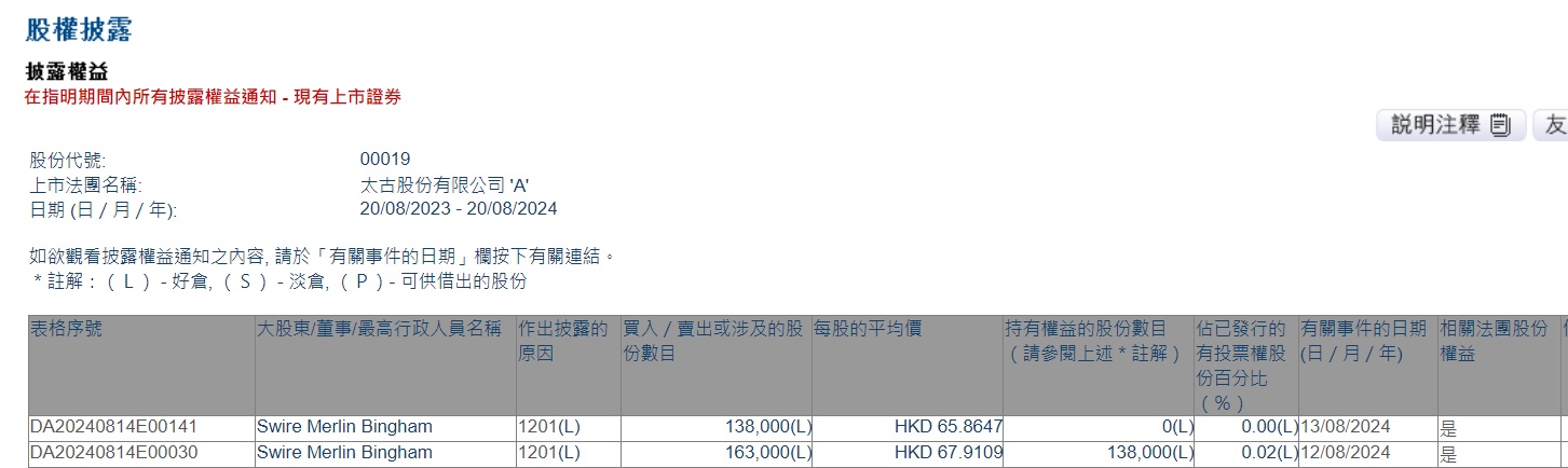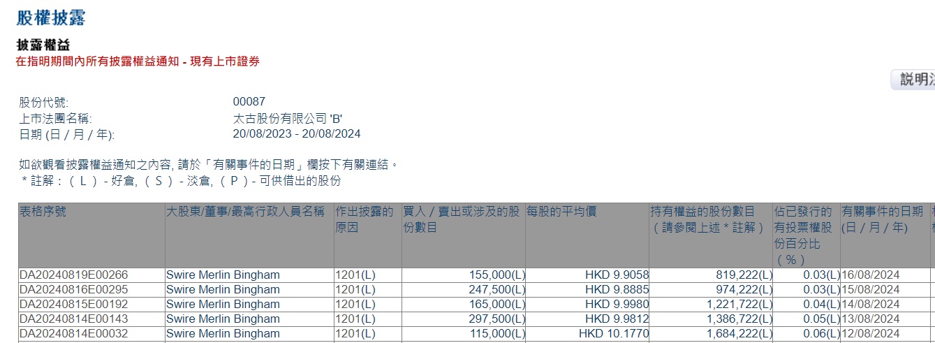智通财经APP获悉,香港联交所最新资料显示,8月16日,太古股份(00019,00087)非常务董事施铭伦(Merlin Bingham
