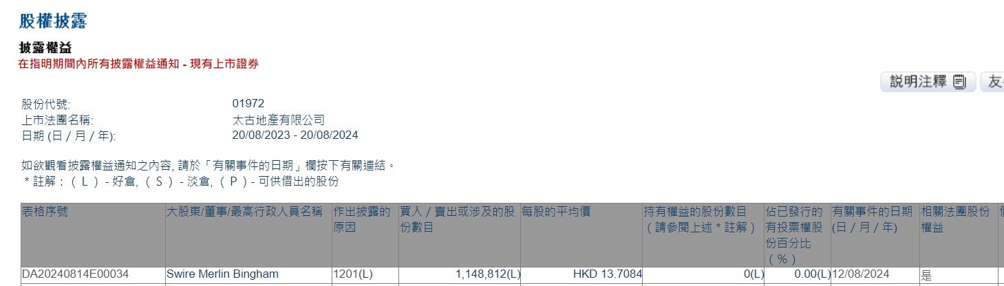 据香港联交所最新资料显示显示,施铭伦于8月12日至13日期间减持该集团A股(00019)和B股,合共涉及30.1万股A股股份及41.25万股B股股份,套现约2429.86万港元。另外,他亦于12日悉数卖出所持的太古地产(01972)共约114.88万股,每股平均价13.7084港元,套现约1574.84万港元。于14、15日,施铭伦分别再度减持B股16.5万股、24.75万股,涉资约409.71万港元。