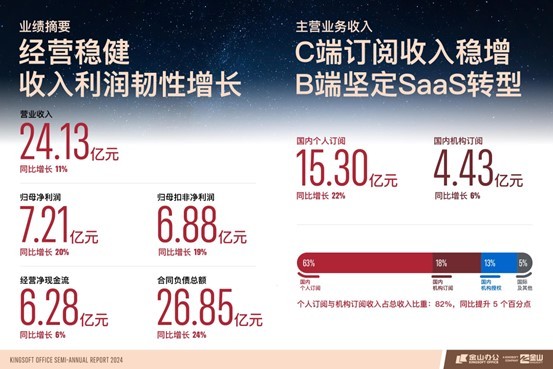 订阅业务作为金山办公的核心增长引擎,2024上半年收入19.73亿元,占总收入比约82%,同比提升近5个百分点。