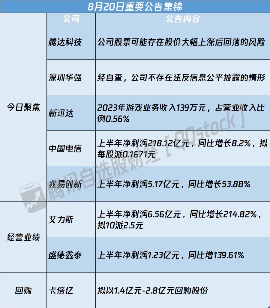 5、中国电信:上半年净利润218.12亿元,同比增长8.2%,拟每股派0.1671元