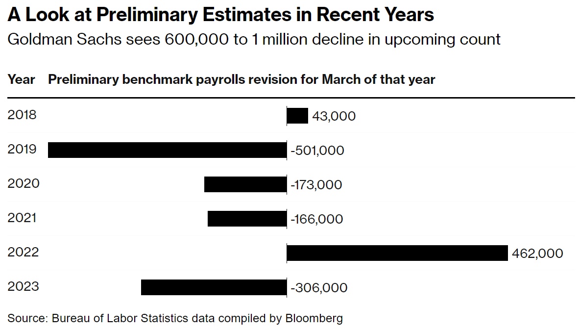 智通财经APP获悉,高盛集团和富国银行的经济学家预计,政府周三发布的初步基准修正数据将显示,截至 3 月份的一年中,就业岗位的增长将比目前的估计至少减少 60 万个,即每月减少约 5 万个。